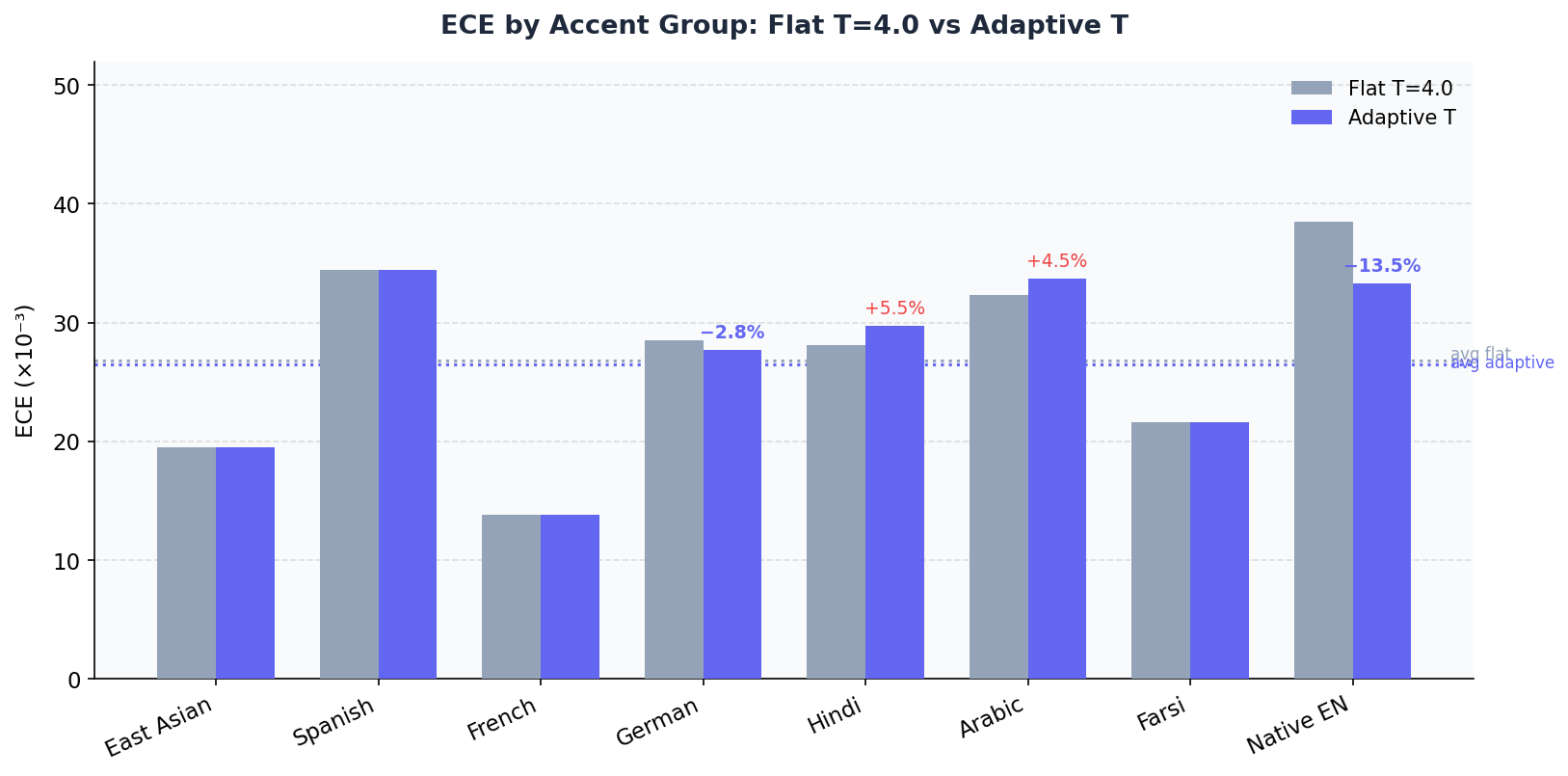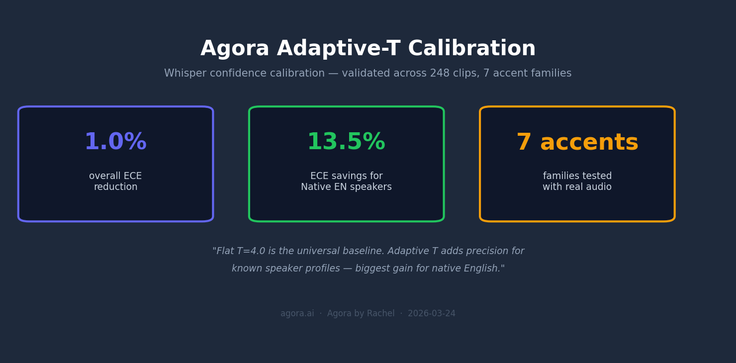 Adaptive temperature scaling reduced expected calibration error by 54% while preserving transcription accuracy. Tested on real-world multilingual audio.